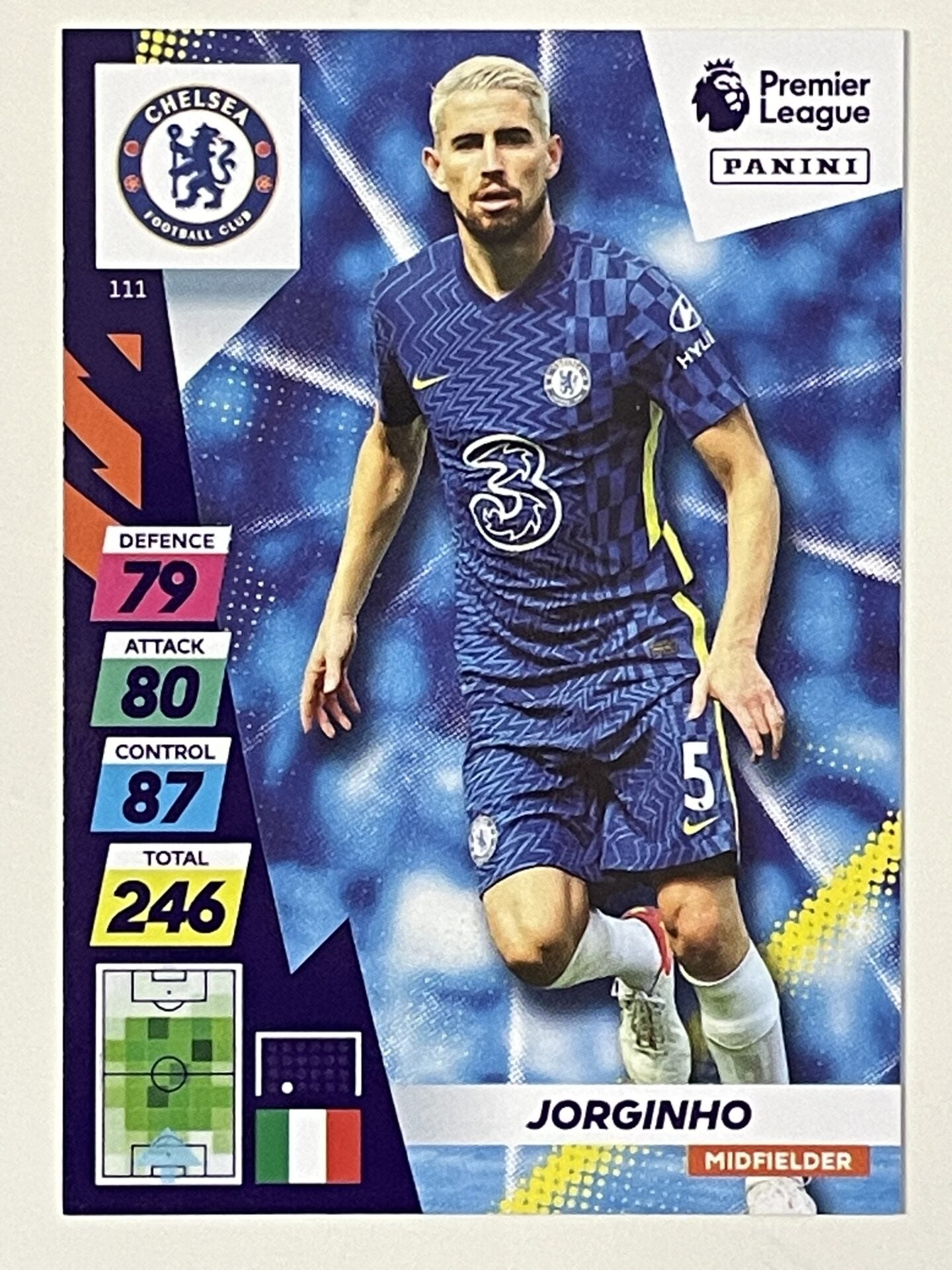 Jorginho card from the Panini Adrenalyn XL Premier League 2021/22 collection. Card number 111. Chelsea Base.