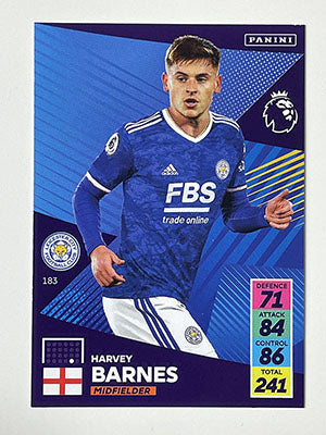 Harvey Barnes Base Card. Card Number 183 from the Panini Adrenalyn XL 2021/22 season. Leicester City Card.