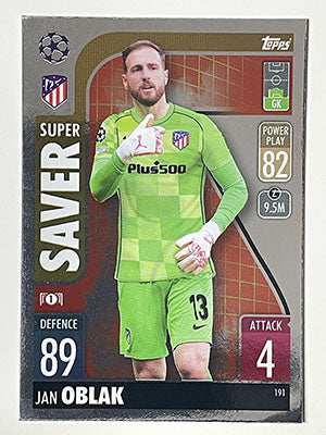 Jan Oblak Super Saver card. Card number 191, part of the Super Saver set of the Match Attax 2021/22 UEFA Champions League collection. Atlético de Madrid card.