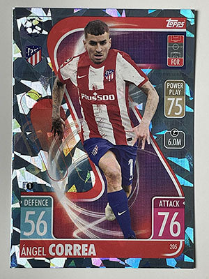 Ángel Correa Crystal Foil Parallel card. Card number 205, part of the Crystal Foil Parallel set of the Match Attax 2021/22 UEFA Champions League collection. Atlético de Madrid card.