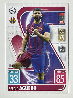 Sergio Agüero Base card. Card number 224, part of the Base set of the Match Attax 2021/22 UEFA Champions League collection. FC Barcelona card.