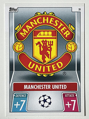 Manchester United Club Badge card. Card number 28, part of the base set of the Match Attax 2021/22 UEFA Champions League collection. Manchester United card.