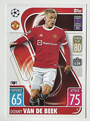 Donny van de Beek Base card. Card number 38, part of the Base set of the Match Attax 2021/22 UEFA Champions League collection. Manchester United card.
