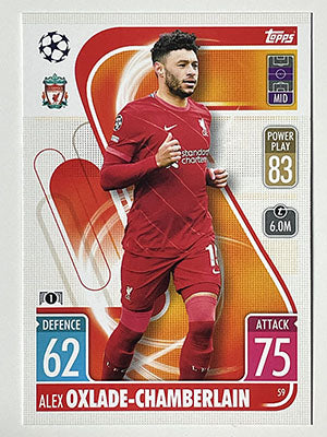 Alex Oxlade-Chamberlain Base card. Card number 59, part of the Base set of the Match Attax 2021/22 UEFA Champions League collection. Liverpool card.
