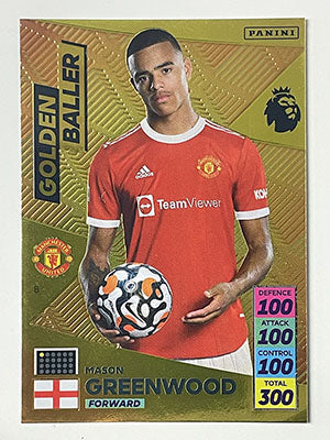 Mason Greenwood Golden Baller card. Card number 8 from the Panini Adrenalyn XL 2021/22 season. Part of the Golden Baller sub-set. Manchester United Card.