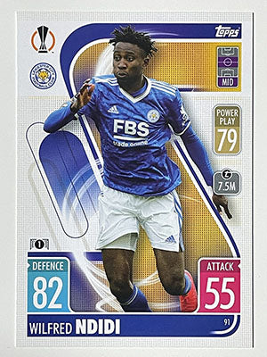 Wilfred Ndidi Base card. Card number 91, part of the Base set of the Match Attax 2021/22 UEFA Champions League collection. Leicester City card.