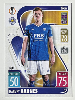 Harvey Barnes Base card. Card number 95, part of the Base set of the Match Attax 2021/22 UEFA Champions League collection. Leicester City card.