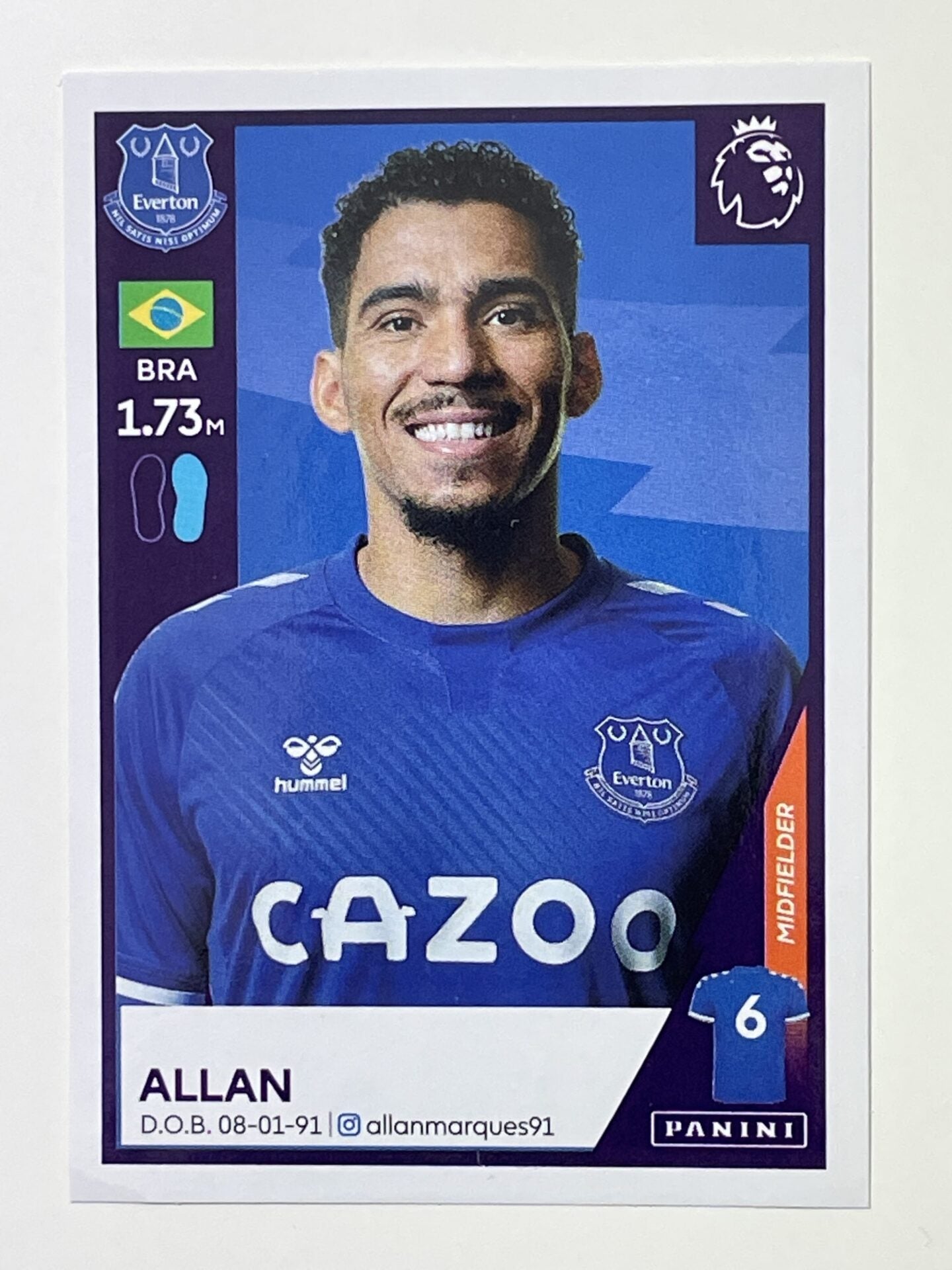 208. Allan Premier League 2021 Sticker (Everton). The Panini Premier League Official Sticker Collection 2021 is here! Back for a second year, it is the ONLY official Premier League sticker collection and features the top footballing talent from one of the most competitive and inspiring football leagues in the world. The collection of 642 stickers features all of the league's top names and rising stars, with plenty of shinies and special stickers to keep an eye out for. This year’s collection features more facts, more stats and more analysis. It includes all 20 Premier League teams and features their kits, their manager’s Premier League record and stats about each player on their individual sticker. There are also four pages dedicated to the Premier League’s most elite players, with even more detailed info.