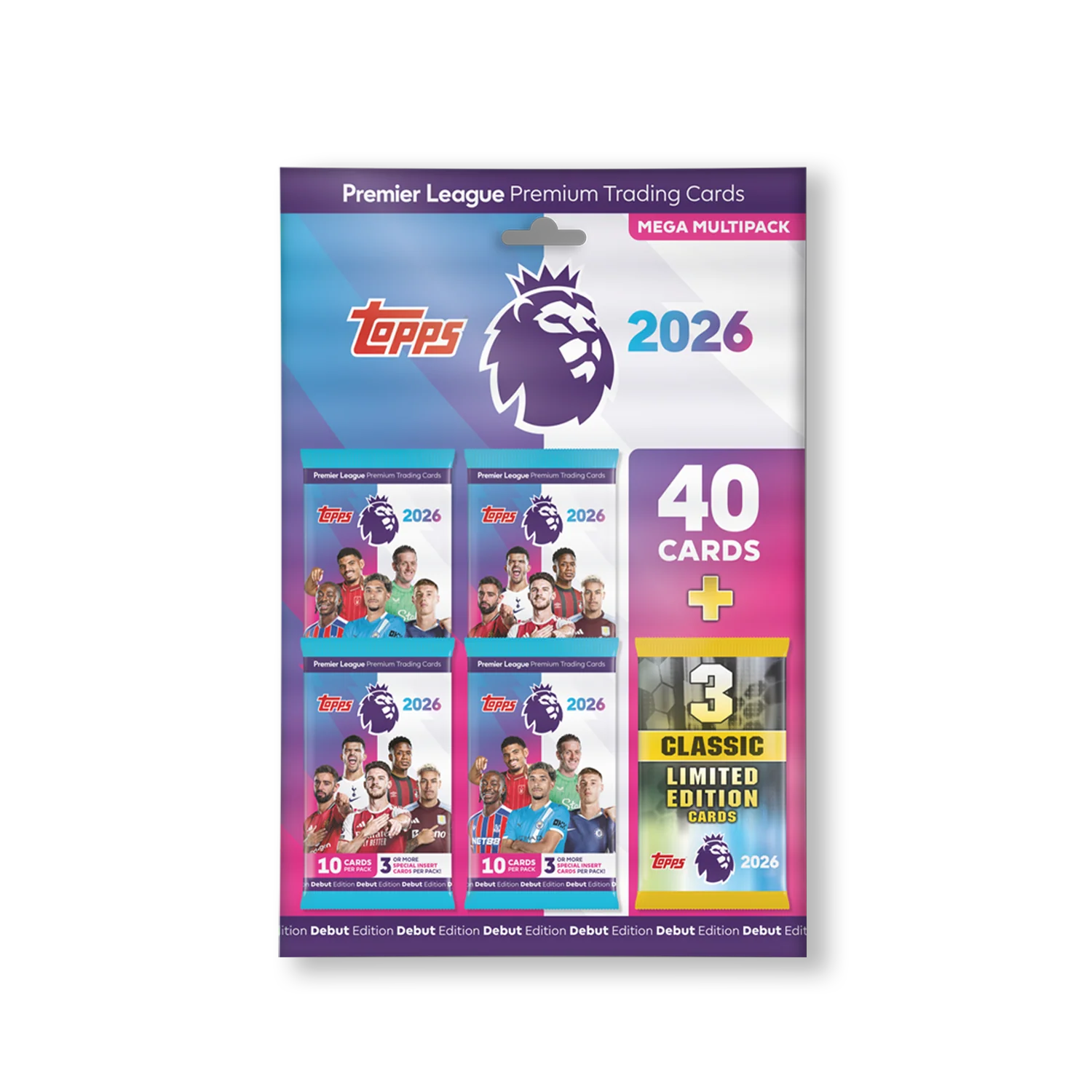 Mega Multipack: 40 cards & 3 Classic LE cards for £13.99. Expand your Premier League 2026 set fast!